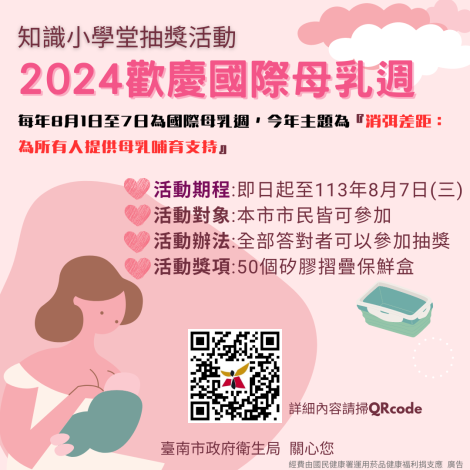 為達成保護、促進及支持母乳哺育,國際母乳哺餵行動聯盟(簡稱WABA) 將每年8月1日至7日訂為『國際母乳週』,今年口號主題為『消弭差距:為所有人提供母乳哺育支持』,臺南市政府衛生局也響應國際母乳週,辦理知識小學堂活動活動,詳細內容請參閱 https://p.tainan.gov.tw//HZJYA2 ,只要答對問題就有機會抽中50個矽膠摺疊保鮮盒,邀約本市市民一同響應母乳哺育。