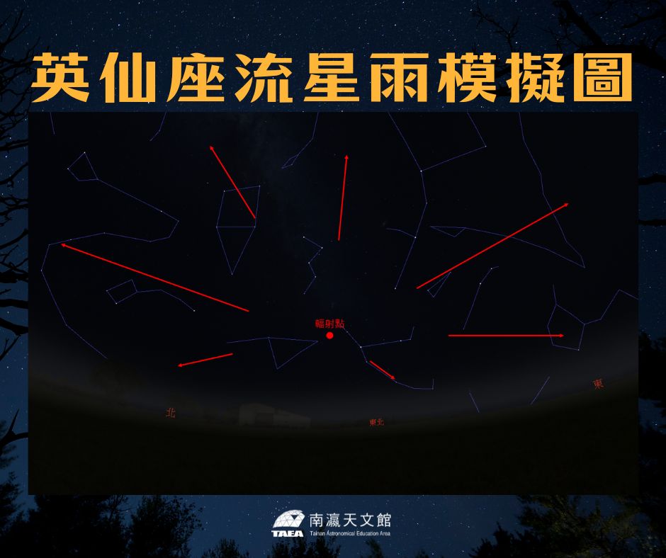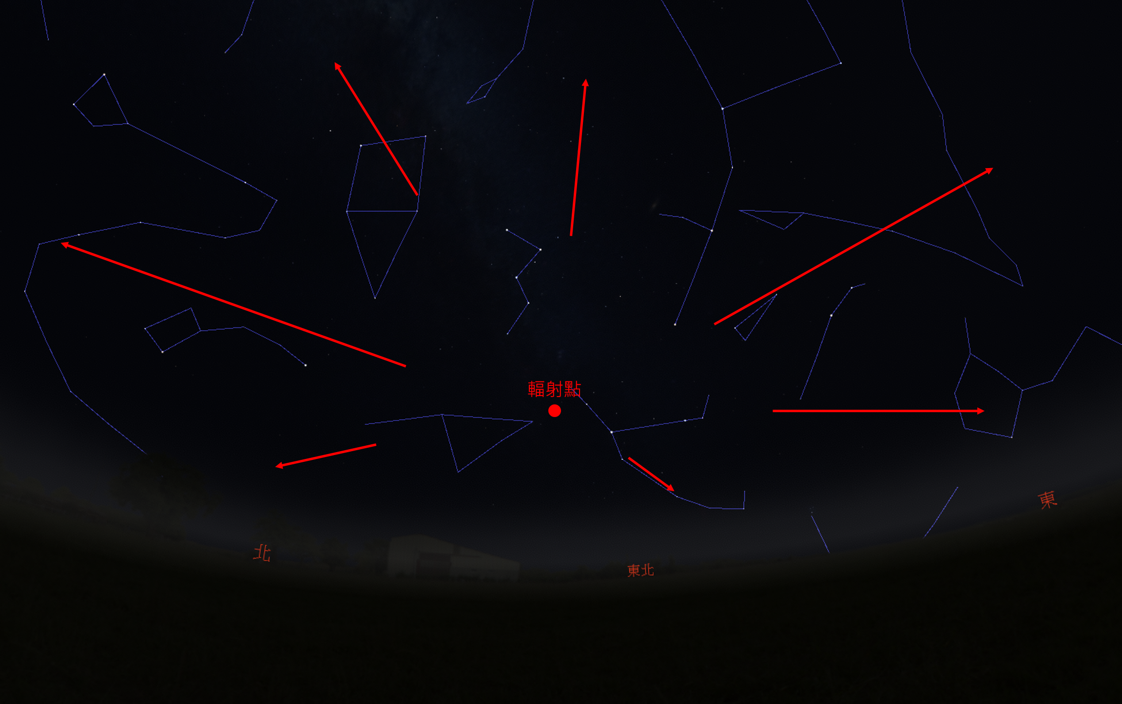 南市教育局鄭新輝局長指出,欣賞英仙座流星雨的風采時,會發現流星的移動方向看起來像是從英仙座四散而出,這是因為當地球進入彗星的碎屑帶時,這些流星體的方向都是相同的,平行進入大氣層的流星,經過透視的效應,流星的軌跡看起來就會交會於遠處的「輻射點」。當晚輻射點約在晚上9時升起,輻射點仰角越高越容易看得到流星,而且午夜過後沒有月光影響,觀測條件更佳!