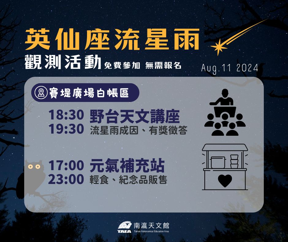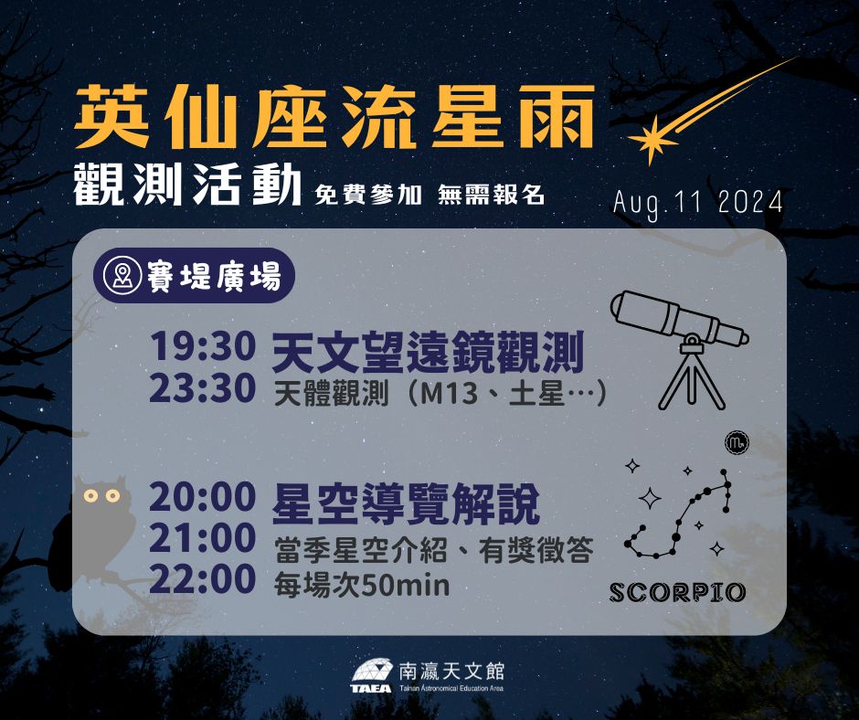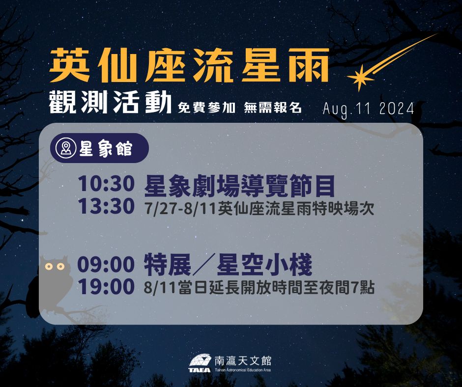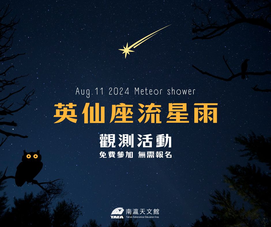 年度三大流星雨之一的「英仙座流星雨」要來啦!極大期於8月12日晚間至13日凌晨,每小時流星數(ZHR值)上看100顆,南瀛天文館配合眾多天文迷的作息,提前至11日夜間辦理免費觀測活動,從晚間18時30分起陸續有野台天文講座、望遠鏡觀測、星空導覽解說,一路持續至午夜12時,免費參加無須報名,歡迎全國天文迷一同共襄盛舉!