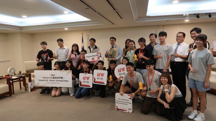 臺南市多位國、高中學子組隊參加今年7月13、14日由澳洲陽光海岸大學(University of the Sunshine Coast)主辦的2024 RoboRAVE機器人世界賽(World Championships)獲得佳績,今(7)日黃偉哲市長接見表揚,大讚同學們潛力無窮,鼓勵同學們持續逐夢,為臺灣、為臺南爭取榮耀。市議員余柷青也到場祝賀。