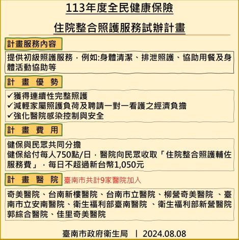 因應國內高齡化與少子化趨勢,衛生福利部今年持續推動健保住院整合照護服務,以滿足急性一般病床病人的需求。臺南市共有9家醫院參與試辦計畫,醫院將根據病患病情安排適當的照護輔佐人力,透過病房團隊的分級分工模式,提供24小時的住院照護服務,每人每日最高可補助1,050元,有效減輕家屬的照顧壓力。