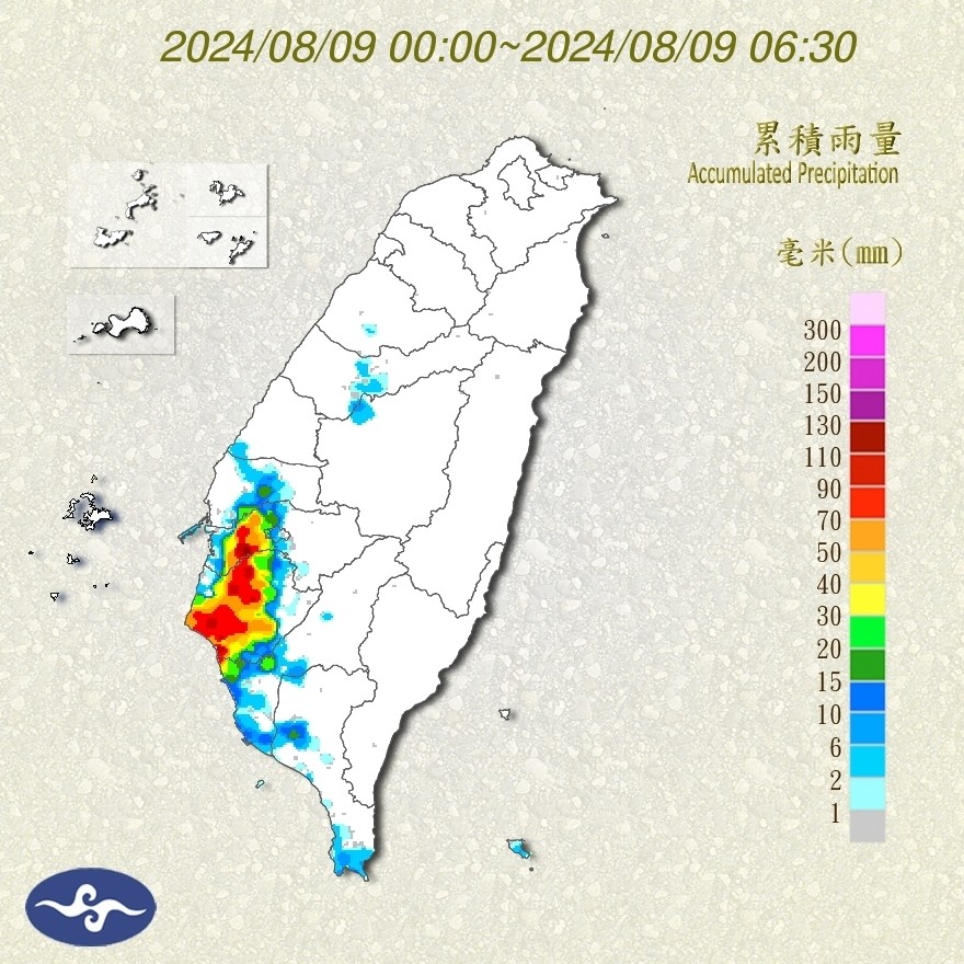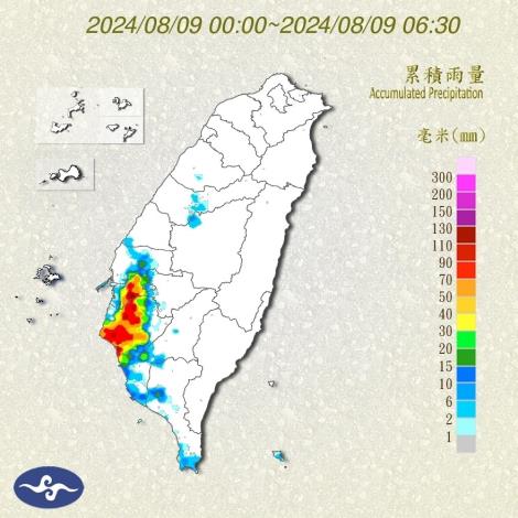 水利局表示,今(9)日至7時,最大累積雨量為安南107毫米、南區100.5毫米、下營99毫米;最大時雨量為新市76.5毫米、新營71.5毫米、官田70毫米;最大10分鐘雨量為安南23毫米、新營21毫米、佳里20毫米。今日至7時20分,有30座抽水站啟動抽水,已啟動抽水量約115萬噸,目前仍有16站抽水站持續運轉抽水中。本市受強降雨影響局部地點短暫積水,雨勢趨緩即退水。另新營開元路地下道因短暫積水,為安全短暫封閉,已於6時45分開放通行,餘不影響交通通行。