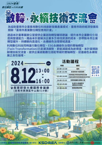 臺南市政府經濟發展局與臺南市總工業會合作,於113年8月12日(一)下午13時假南寶樹脂集團研發大樓國際會議廳舉辦產業「數轉x永續技術交流會」,以數位及永續經營雙軸轉型為主題,邀請產、官、學界菁英參加,融合永續發展及生成式人工智慧現況,激發企業對未來營運的新思維。報名連結:https://reurl.cc/RqadDZ