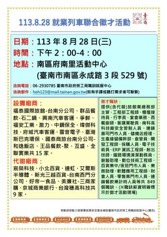 為打造黃偉哲市長「希望家園」的施政願景,勞工局積極辦理各項就業徵才活動,並因應產業求才需求,勞工局職訓就服中心113年8月28日(週三)下午2時至4時在南區府南里活動中心(臺南市南區永成路3段529號)辦理『113.8.28就業列車聯合徵才活動』,邀請24家廠商提供849個職缺,歡迎求職民眾踴躍前往參加,洽詢電話:06-2930785。