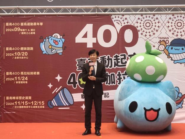 「臺南動起來,400咖拉棒!」400年一度,集結嘉年華、馬拉松和棒球展的運動盛會,9月即將熱鬧開場!為號召全國民眾來到臺南參加臺南400專屬體育盛事,今(14)日市府特別來到臺北車站一樓多功能展演廳舉辦聯合記者會,由統一獅啦啦隊的瑟七、JOY及艾璐帶來活力滿分的啦啦隊表演,為活動揭開序幕。今年臺南不僅主辦8月「臺灣文博會」和10月「臺灣設計展」,更用行動力挺在地文創IP,找來超人氣的「貓貓蟲咖波」代言,今天咖波也在舞台旁跟著音樂手舞足蹈;邀請大家跟著貓貓蟲咖波動起來,一起來森巴臺南啵!