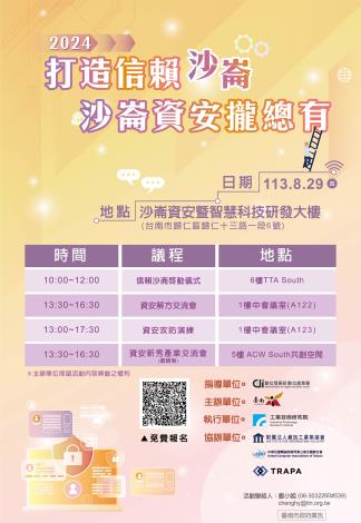 不容錯過的資安盛會,誠摯邀請各界踴躍參與!即日起,歡迎至活動網站(https://p.tainan.gov.tw/jL1vR)了解詳情。