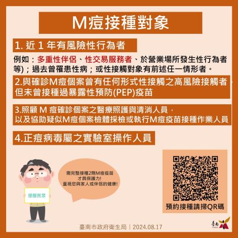 臺南市衛生局李翠鳳局長提醒,國際上M痘疫情已構成「國際關注公共衛生緊急事件」,現處暑假期間,國際旅遊頻繁,社交活動頻率大增,提醒民眾注意個人防護、避免出入可能與不特定人士親密接觸之社交活動等風險場域,尤其是可能發生性行為的營業場所,另呼籲,符合M痘疫苗接種條件的民眾,包括:近1年有風險性行為者(例如:多重性伴侶、性交易服務者、於營業場所發生性行為者等)、過去曾罹患性病、或性接觸對象有前述任一情形者等,應儘速完成2劑疫苗接種,本市12家合作醫院及37區衛生所提供其接種服務,詳請可上臺南市政府衛生局網站查詢( https://gov.tw/K3S )。