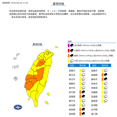 水利局表示,為因應低壓帶及西南季風影響,已於昨(15)日完成重點設施防汛巡檢整備及滯洪池預洩降,並針對62座抽水站及478台移動式抽水機進行油料補充及確保可正常運作。為利災情處置,今(16)日也水災三級開設進駐水情中心因應。另各區公所及水利局已備妥約23萬砂包,並將約3,600片防水擋板分發予區公所及自主防災社區視天氣及實際狀況使用。