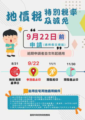 已經擁有土地或即將購買土地的人,您不能不注意!臺南市政府財政稅務局提出兩個關鍵日期提醒民眾,一個是8月31日地價稅納稅義務基準日,另一個是9月22日地價稅自用住宅用地、工業用地等適用特別稅率及各項減免稅地之申請期限截止日。