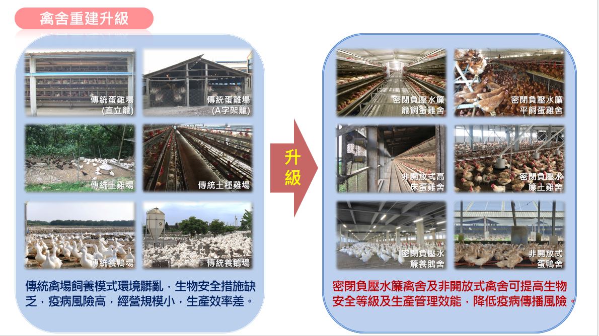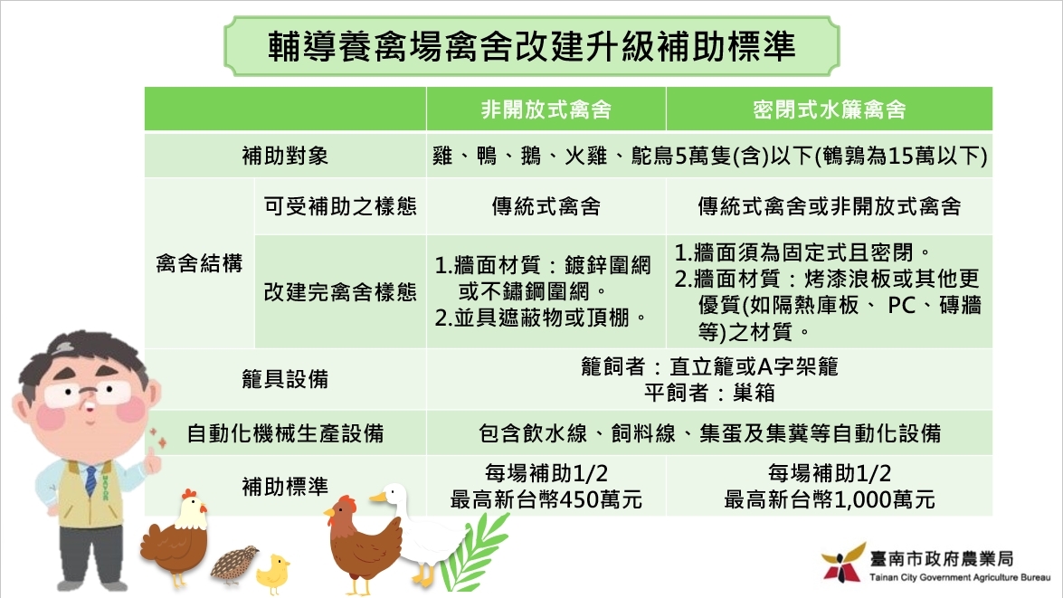 農業局並說明,農業部補助「禽舍改建升級計畫」於明(114)年是第3年,畜牧戶申請開放式禽舍改建為非開放式禽舍,可補助 1/2,最高不超過 450 萬元;申請改建為密閉水簾式禽舍,補助 1/2後最高不超過 1,000 萬元,本局亦每年持續向中央爭取補助經費;另有家禽產業淨零智慧循環永續設施(備)補助,可向中華民國各家禽產業協會提出申請,以期更多家禽業者加入禽舍升級行列,增強極端氣候的因應能力,並改善民眾對養禽場環境之觀感。