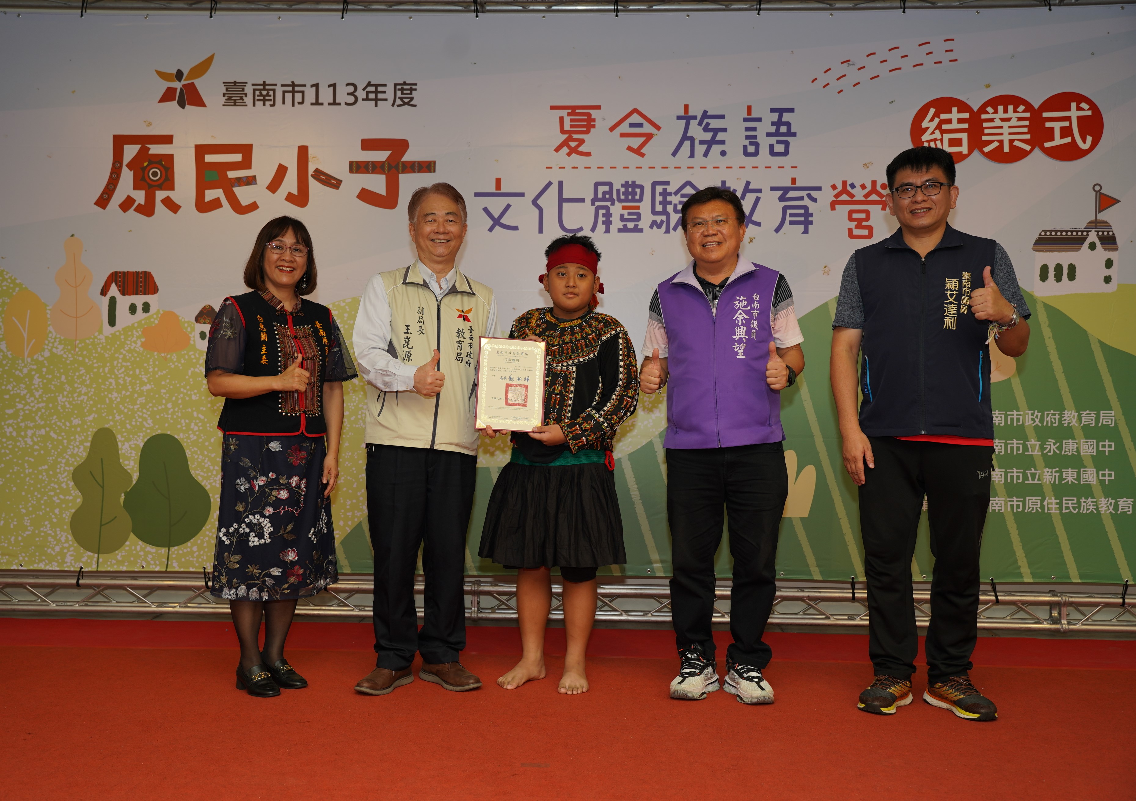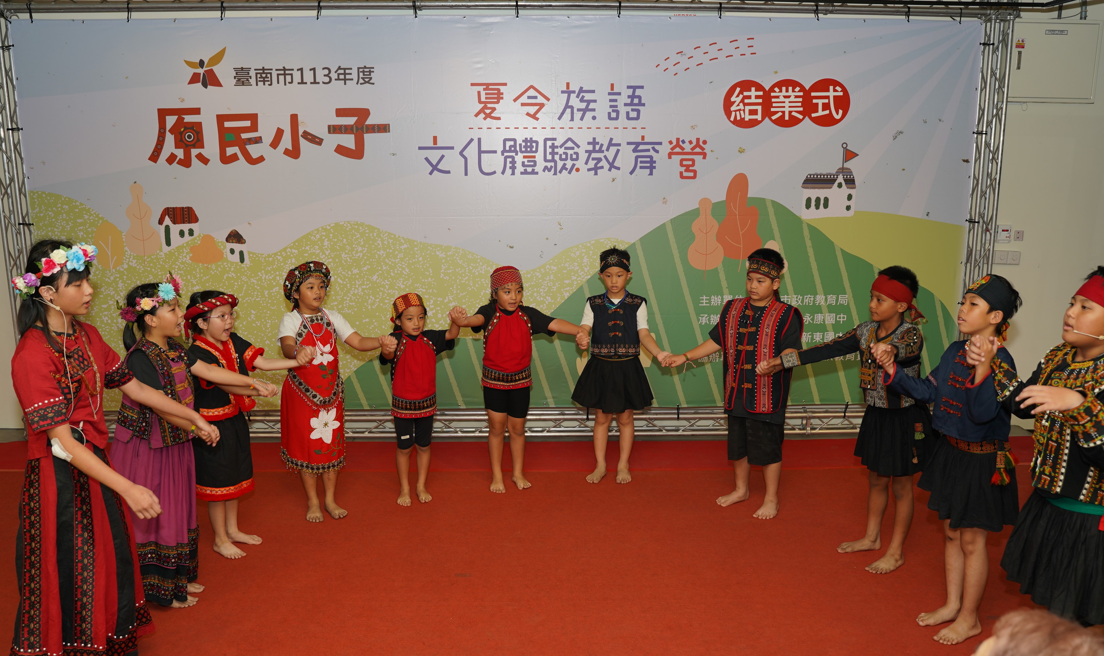 原民小子結業了!臺南市113年原民小子夏令沉浸式族語文化體驗教育營今(22)日下午在永康國中舉辦結業式,64位原民小子展現6週豐碩的學習成果,大跳阿美族、排灣族部落舞、詠唱傳統歌謠以及演奏太魯閣族木琴,並展示繩結飾品、琉璃串珠、族語學習筆記等,教育局副局長王崑源代表市府頒發感謝狀及結業證書,感謝14位族語老師的辛勞也恭喜同學順利完成課程。市議員Ingay Tali穎艾達利、施余興望Tjakumay Tagaw及臺南市原民會主委白惠蘭Salau Kaljimuran也到場表達祝福,場面熱鬧溫馨。