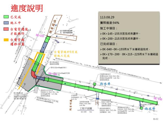 水利局補充,雨水下水道建設最常遇到問題即為牴觸地下維生管線,須俟管線遷移後方能施工,惟管線遷移時可能需停水停電,影響周邊住戶,增加管線遷移困難度。水利局於工程設計及施工階段,均積極邀集各管線單位配合遷移,截至目前已辦理12次管線協調。並針對無法遷移管線進行箱涵路線調整,以加速工程進行。