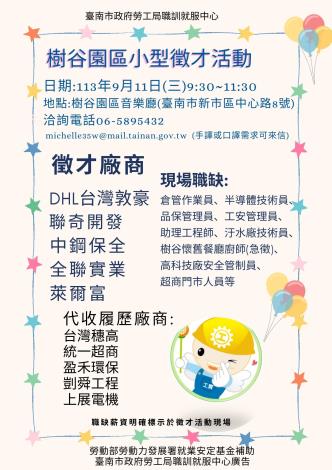 113/9/11(三)勞工局職訓就服中心辦理樹谷園區音樂廳小型徵才活動,歡迎求職民眾踴躍參加。