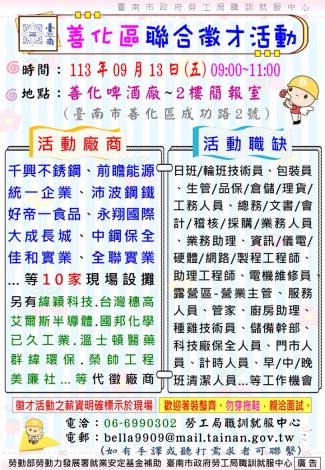 113/9/13(五)勞工局職訓就服中心辦理2024善化區聯合徵才活動, 歡迎求職民眾踴躍參加