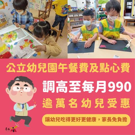 為提升幼兒用餐品質並兼顧幼兒成長所需營養,臺南市政府調增公立幼兒園午餐及點心費基準,並積極向中央爭取增加補助款,113學年度終於獲中央同意,市長黃偉哲宣布,自113學年度起,南市公立幼兒園午餐費將由現行每月795元調高為990元、點心費也由每月800元調高為990元,平均每天每位幼兒餐點費調高18元,調幅高達25%。為了減輕家長負擔,調增費用約4,864萬1,197元全部由政府負擔,今天是開學日,也是黃偉哲送給幼兒一個最好的禮物,受惠幼兒達1萬312名。