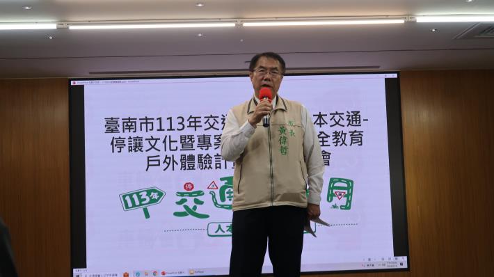 為響應交通部將9月訂為全國「交通安全月」,臺南市長黃偉哲今(16)日與教育局召開臺南市交通安全月「人本交通-停讓文化」暨交通安全教育體驗計畫專案記者會。開場由下營國中學生透過國語、英語及台語演出生活情境行動劇,傳達交通安全正確觀念,趣味十足。黃偉哲市長與師生代表共同宣誓,提升市民交通安全意識,型塑停讓文化。