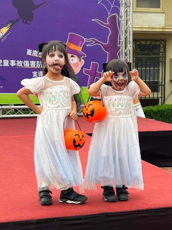 臺南市政府尤天厚副秘書長也特地親臨現場提醒各位市民朋友,兒童及青少年最容易受傷及死亡的原因就是事故傷害,希望大家共同重視這個議題;現場還邀請臺南市政府各相關局處包含警察局、消防局、觀旅局及教育局等提供之兒童事故傷害衛教闖關活動,讓全家人了解各種生活中可能遇到的事故傷害,以及故事媽媽透過繪本演說,讓小朋友學習各種出門遊玩要注意的安全問題,另外氣球藝人生動活潑的表演及小寶貝們的萬聖節服裝走秀表演,昨日活動共有325人參與,一家大小在充滿萬聖節活潑熱鬧氣氛中,獲得滿滿有關兒童事故傷害相關知能。