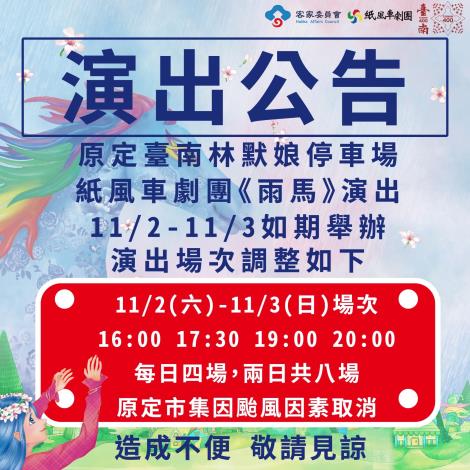 由客家委員會與紙風車劇團攜手打造的客家親子音樂劇《雨馬》即將在臺南首次亮相,11月2日至3日(本週六、日)於安平林默娘公園停車場隆重登場。劇中有高達四層樓、重達七噸的全台最大行動藝術裝置「雨馬」、歌舞、特技及燈光特效,視覺效果震撼且動人。這場演出為《雨馬》2024年度的最終場,機會難得,誠邀觀眾一同感受藝術魅力!