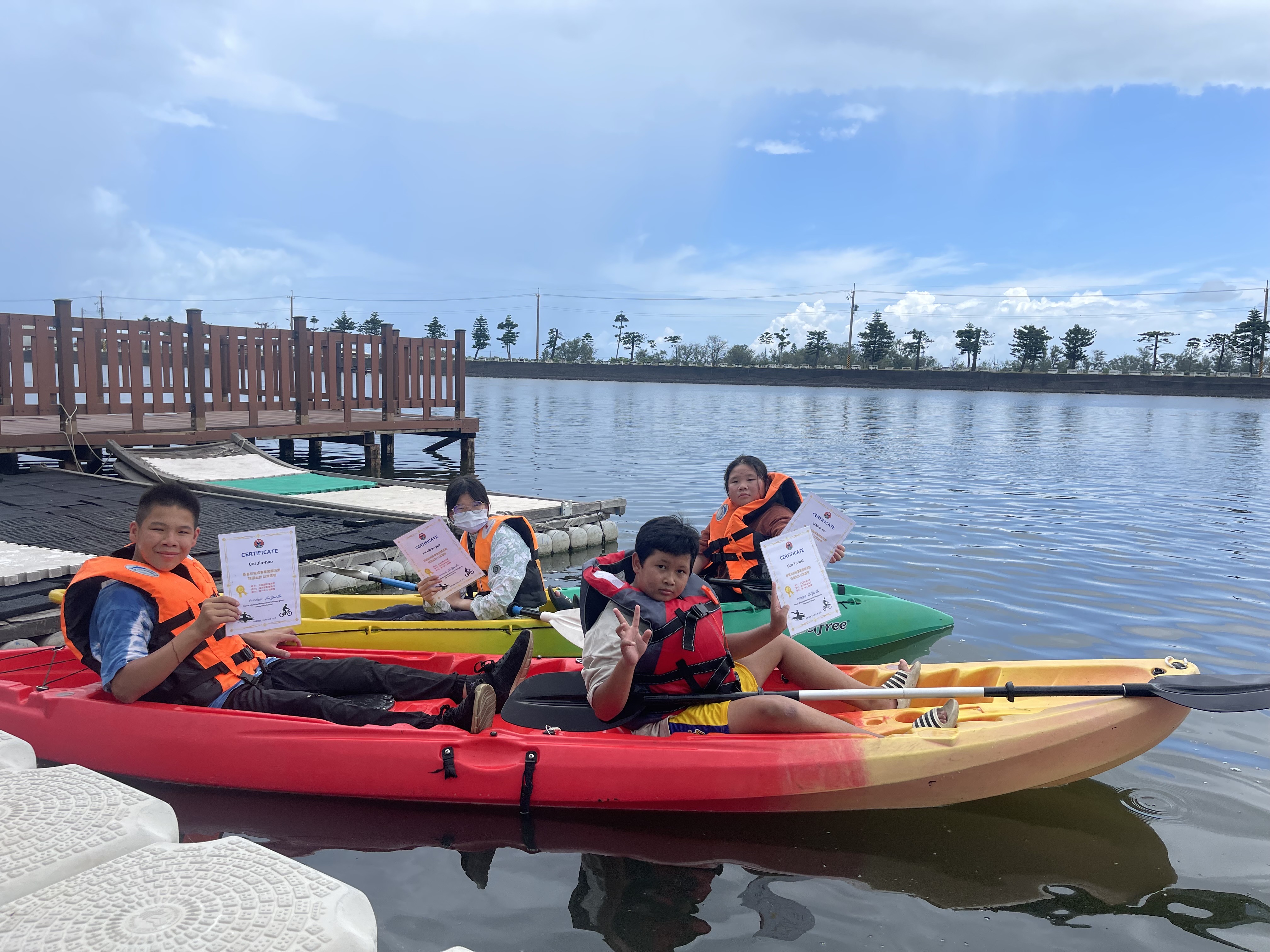 「『虱』『生』共學,舟遊雙春」課程方案以海洋教育課程為基底,結合在地虱目魚養殖與聯合國永續發展目標(SDGs),跨校合作課程涵蓋紅樹林生態探索、海洋獨木舟體驗及小鐵人三項活動等多元內容。口埤實小校長王朝賜表示,透過這樣跨校合作課程設計,非臨海學校的學生也能夠認識在地文化,還能提升海洋素養,成為守護海洋的未來主人翁。