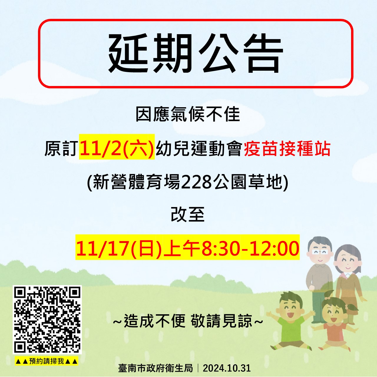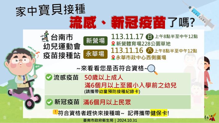 颱風康芮逐漸逼近台灣,本市體育局為考量幼童安全,原訂11月2日週六在新營體育場幼兒運動會活動將延期至11月17日週日辦理,故疫苗接種站也將配合活動延期設立。