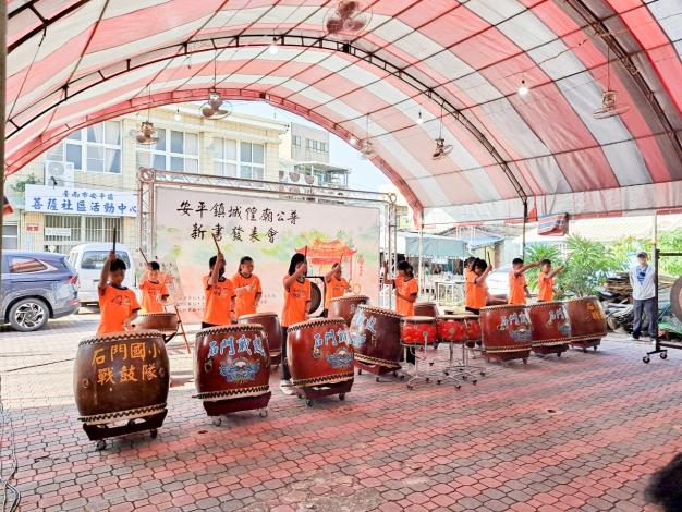 今天新書發表會開始,由石門國小戰鼓社演出暖場,並與現場所有來賓合影一同見證這項傳統文化的保存,接著邀請石門國小吳怡霏、吳家楨、許以青、游匡菁4位同學來分享這次製作的心得,他們非常開心能有這個難得可貴的機會來學習,大家各司其職分配繪本的角色來繪製,透過老師的指導及團隊合作的精神來完成這項工作。最後由吳明勳老師來和大家分享文字書寫的內容,清楚介紹公普的每項科儀,彰顯了安平地區對城隍廟的尊崇。
