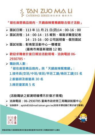 113/11/21(四)勞工局職訓就服中心辦理「碳佐麻里精品燒肉、天鍋麻辣鴛鴦鍋聯合徵才活動」招募90名餐飲人員,歡迎求職民眾踴躍參加