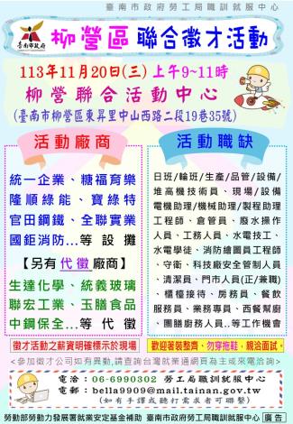 113/11/20(三)勞工局職訓就服中心辦理2024柳營區聯合徵才活動,歡迎求職民眾踴躍參加