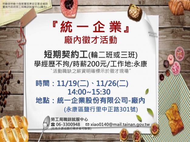 為打造黃偉哲市長「希望家園」的施政願景,勞工局積極辦理各項就業徵才活動,並因應產業求才需求,勞工局職訓就服中心將於11月19及11月26日(週二)14時至15時30分在統一企業股份有限公司(臺南市永康區中正路301號)辦理廠內徵才活動,提供短期契約工30個職缺,歡迎求職民眾踴躍前往參加,洽詢電話:06-3300948。