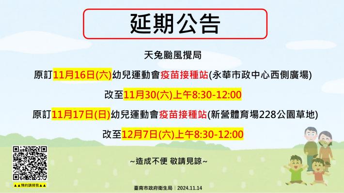 天兔颱風攪局,考量幼童安全,永華場及新營場幼兒運動會疫苗接種站活動延期至11月30日(週六)及12月7日(週六)