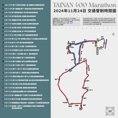 臺南400馬拉松挑戰賽將於11月24日在臺南市新營體育場盛大舉行,為維護交通秩序與活動安全,市長黃偉哲表示,臺南市政府將針對賽事沿線行經路段進行交通管制,整體管制時間預計將從24日上午4時起至13時止進行彈性交管,當中雙向封閉管制的路段共7條,包含新營三興街(長榮路-建國路)、新營建國路(南77-新運五路)、新營糖鐵自行車道(南85-長榮路南172)、新營南72(台19甲-角帶里公車站)、鹽水文武街(武廟路-治水路)、下營南63(裕農街-南58)與下營南70-1(南174-南69)等,其餘路段則採單側管制車輛通行,建議市民朋友當天行前務必搜尋相關資訊,盡量避開管制時間及路段,並多加運用改道路段以免耽誤行程。