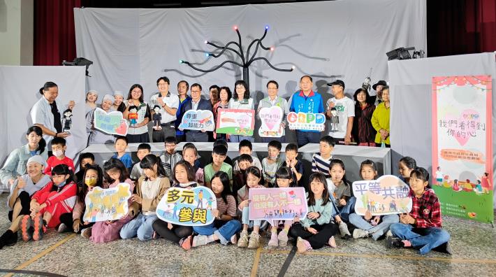 為落實《身心障礙者權利公約》(簡稱CRPD),臺南市政府社會局運用公彩盈餘基金及公彩回饋金委託天尚科技有限公司辦理CRPD社區巡迴劇場,今(20)日於麻豆區培文國小舉辦「『我們看得到你的心』臺南市政府社會局CRPD社區巡迴劇場開跑記者會」及首場大型演出,社會局陳雅芬主任秘書代表黃偉哲巿長出席,宣布接下來今年將於各社區/校園進行12場次的巡迴展演,預計將有上千名的學童及社會大眾參加,希望藉由淺顯易懂的戲劇表演方式,有效地傳達與落實身心障礙者權利。麻豆區楊政舉區長、巿議員尤榮智服務處代表、培文國小陳明和校長、中興里吳振和里長及貓頭鷹兒童劇團導演朱曙明等多位貴賓親自出席。