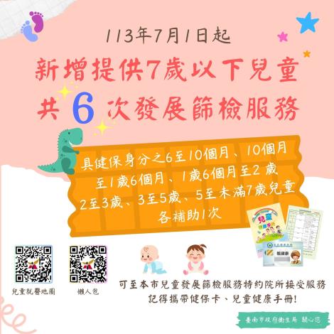 自113年7月1日起,新增7歲以下兒童共6次發展篩檢服務,可攜帶健保卡及兒童健康手冊至兒童發展篩檢服務合約院所(本市目前共有83家,可至兒童就醫地圖( https://p.tainan.gov.tw//Wr4sY1 )查詢),由接受過標準化篩檢工具訓練的兒科、家醫科專科醫師或幼兒專責醫師,分別依粗大動作、精細動作、語言認知及社會發展等四大面向為孩子提供發展篩檢服務。若經篩檢發現任一面向異常,由醫師經健保署「電子轉診平台」轉介至本市7家兒童發展聯合評估中心(包含成大、奇美、安南、柳營奇美、佳里奇美、台南新樓及部立臺南醫院等)。