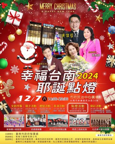 臺南市政府訂於12月7日(星期六)晚間6點20分在民治市民廣場舉辦「2024幸福台南.耶誕點燈」活動。當(7)天從2點開始,有倉庫市集、親子DIY、小小波麗士陸續登場,晚上更有精彩的舞台表演、摸彩及發送耶誕小禮物等活動,內容豐富有趣,歡迎大家一起鬥陣來熱鬧。