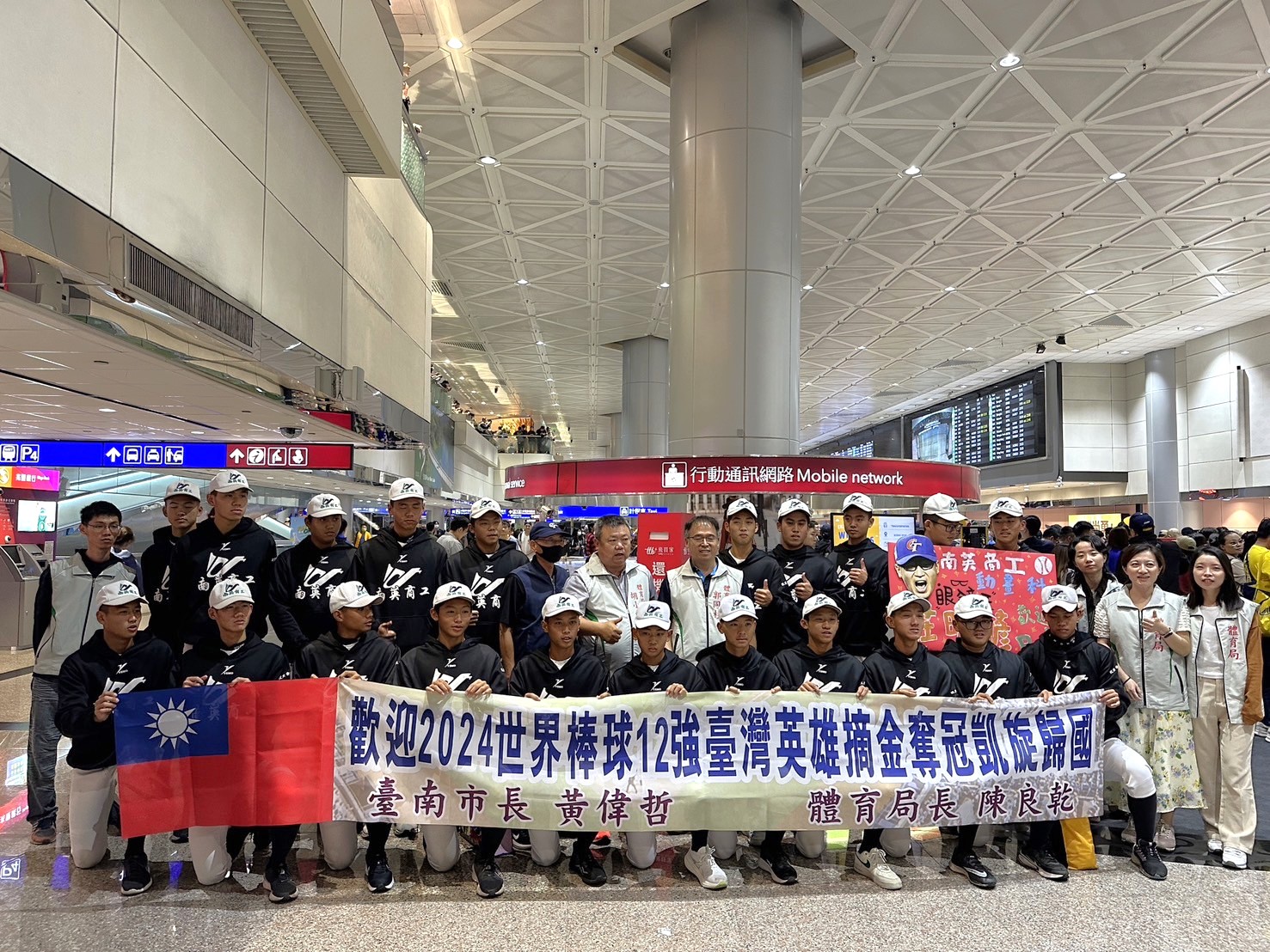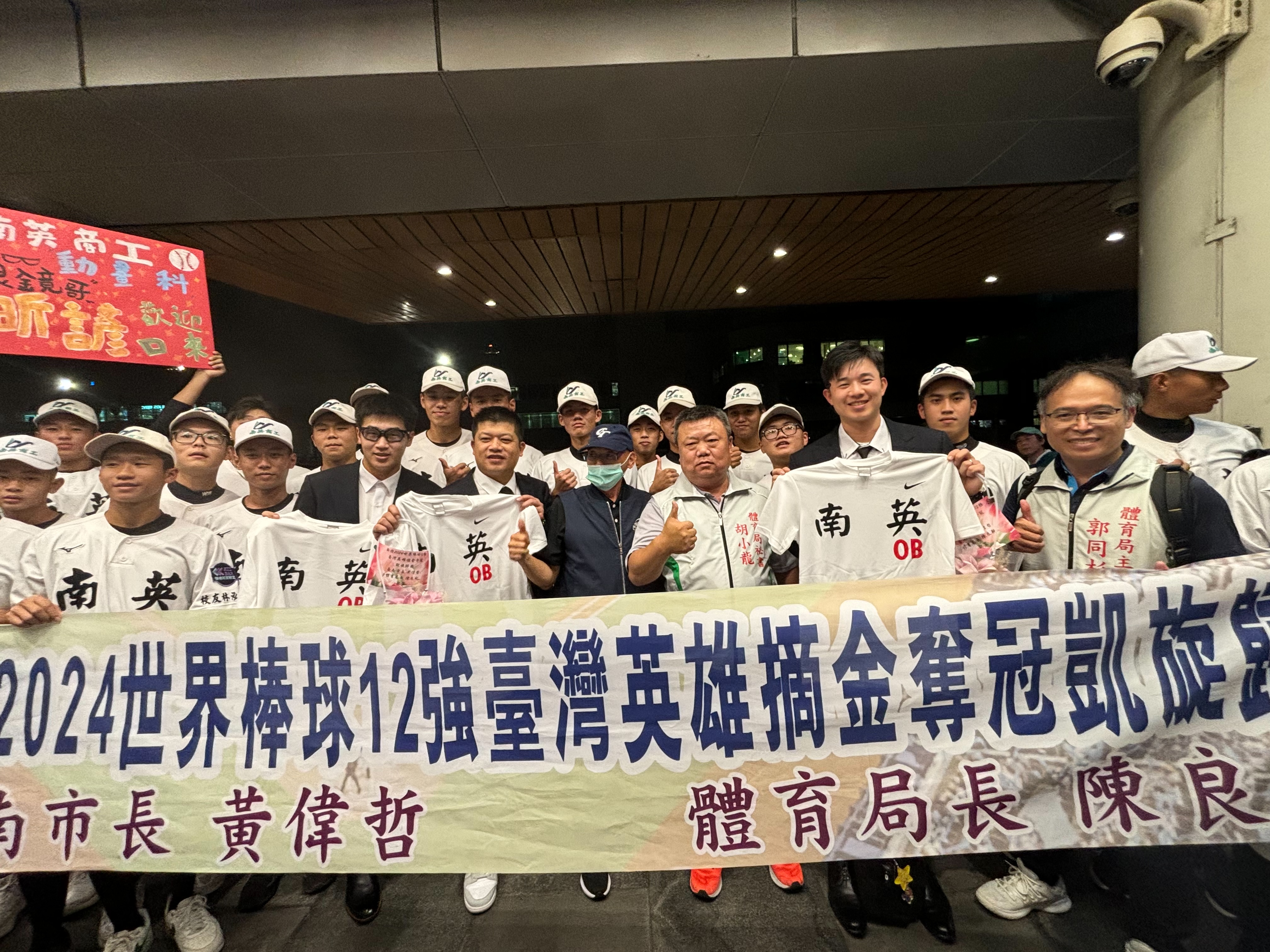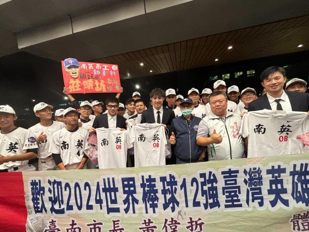 中華隊24日於第3屆世界12強棒球賽以4:0佳績擊敗日本隊,撼動日本多年不敗紀錄,勇奪冠軍,創造歷史。代表團成員於昨晚(25日)返抵國門,其中包含來自臺南市的王建民、陳江和、陳傑憲、林安可、潘傑楷及在地職業棒球隊統一獅的高志綱、林岳平、郭俊麟、邱智呈、南英工商校友莊昕諺、黃子鵬。市長黃偉哲特別指派體育局偕同南英工商棒球隊陳献榮教練、郭愿杰教練及隊員到場獻花迎接,轉達市長祝福之意,慶賀我國拿下世界冠軍的殊榮。