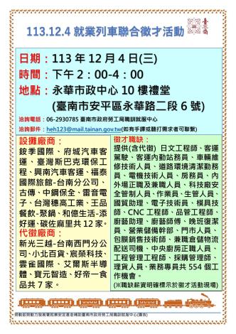 為打造黃偉哲市長「希望家園」的施政願景,勞工局積極辦理各項就業徵才活動,並因應產業求才需求,勞工局職訓就服中心將於113年12月4日(週三)下午2時至4時在永華市政中心10樓禮堂(臺南市安平區永華路二段6號)辦理『113.12.4就業列車聯合徵才活動』,邀請19家廠商提供554個職缺,歡迎求職民眾踴躍前往參加,洽詢電話:06-2930785。