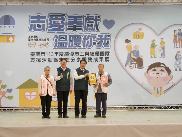 臺南市政府113年績優志工表揚於11月30日在勞工育樂中心舉行頒獎典禮,中西區公所由資深志工陳東炎先生與葉惠珠女士參與選拔,獲得黃偉哲市長頒發全市僅有5組的「績優家庭志工」殊榮。