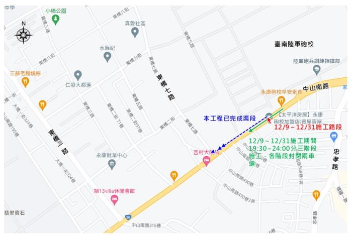 為有效改善永康區中山南路每逢豪雨即造成積淹水災情,臺南市政府水利局刻正辦理「永康區中山南路排水渠道災後復建工程」,將於中山南路北側(東橋七路~中山南路568巷)設置雨水下水道。目前工程已完成新建中山南路北側箱涵,將接續施作中山南路568巷口橫越中山南路之管涵工程,將分為3階段施工,每階段施工將封閉中山南路兩車道。