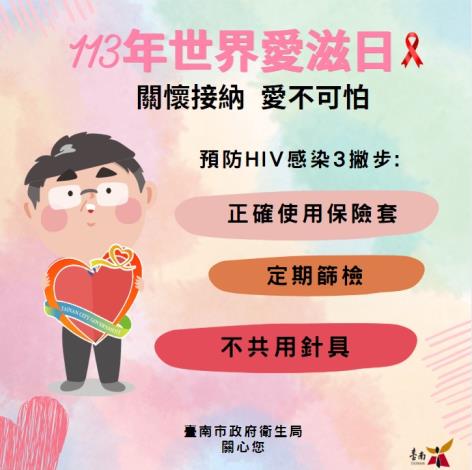 依據衛生福利部疾病管制署統計資料顯示,南市本年度截至10月31日,新增愛滋病毒感染者共計74人,較去年同期(57人)增加17人;90%以上是因不安全性行為感染。為此,市長黃偉哲透過影片向市民宣導愛滋預防「三撇步」:正確使用保險套、不共用針具、定期篩檢。另提醒民眾若有以下感染風險行為,如多重性伴侶、感染性病、使用成癮性藥物或共用針具等,應每3至6個月接受篩檢,市民可前往本市37區衛生所、南方彩虹街6號、合約醫院等接受免費愛滋篩檢或購買愛滋自我篩檢試劑(https://hiva.cdc.gov.tw/selftest/)。如有感染HIV風險,經專業醫師評估後,市民也可考慮使用暴露前預防性投藥(PrEP)或暴露後預防用藥(PEP)。相關資訊可至臺南市政府衛生局網站查詢(https://gov.tw/Rt2)。