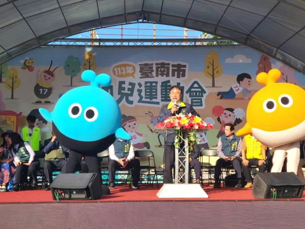 臺南市政府今(30)日於永華市政中心西側廣場盛大舉辦113年臺南市幼兒運動會,活動吸引31間幼兒園,共46隊,超過1,800名親子熱情參與,現場洋溢著歡樂與活力,黃偉哲市長特地蒞臨現場,與114年全中運吉祥物大員和甜甜共同歡迎大小朋友,表達對推廣幼兒運動普及化的高度重視,並期待透過運動拉近家庭情感距離,助益幼兒的健康發展與成長。