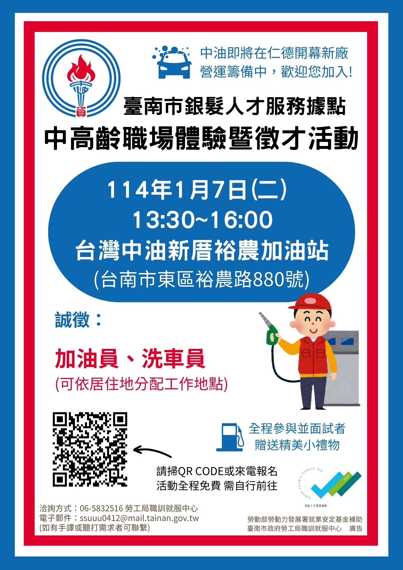 為打造黃偉哲市長「希望家園」的施政願景,勞工局積極辦理各項就業徵才活動,並因應產業求才需求,臺南市銀髮人才服務據點將於1月7日 (星期二) 13時30分至16時舉辦單一徵才暨職場體驗活動,地點於台灣中油新厝裕農加油站(臺南市東區裕農路880號),提供40個職缺,讓求職者至企業了解職場環境、職務內容與工作體驗實作,並安排現場面試媒合就業,提供企業與求職者面對面徵才管道,歡迎55歲以上有求職意願者、已退休欲二度就業者踴躍報名參加(https://reurl.cc/Egpk2v),洽詢電話:06-5832516。
