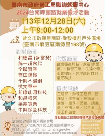 113/12/28(六)勞工局職訓就服中心辦理「2024台南呷頭路就業徵才活動」歡迎求職民眾踴躍參加