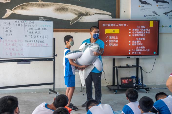 該中心的亮點之一,就是展示著全臺最大的抹香鯨標本,搭配互動教學,讓參與者深入了解鯨豚的生態特性與保育挑戰。課程中還會教導正確的救援SOP,以及如何通報擱淺狀況,幫助學員成為保育行動的一份子,增強對海洋生物保護的參與感。