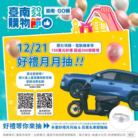 即日起,臺南購物節舊會員回娘家登錄消費發票,將有機會抽到YAMAHA電動機車1台。此外,針對臺南公有零售市場及夜市特別加碼加菜金,預計在12月21日抽獎先抽出現金2萬元加菜金,經發局特別呼籲,專屬市場及夜市的加菜金還會持續祭出,請民眾踴躍至臺南公有零售市場消費。