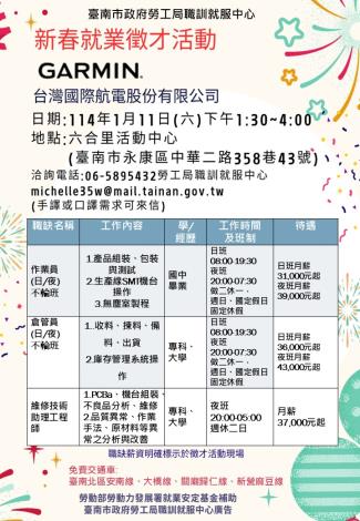 為打造黃偉哲市長「希望家園」的施政願景,勞工局積極辦理各項就業徵才活動,並因應產業求才需求,勞工局職訓就服中心將於114年1月11日(週六)下午1點30分至4點在六合里活動中心(臺南市永康區中華二路358巷43號)辦理GARMIN台灣國際航電股份有限公司新春就業徵才活動,提供固定日/夜班作業員、固定日/夜班倉管員、夜班維修技術助理工程師共90名,歡迎求職民眾踴躍前往參加,洽詢電話:06-5895432。