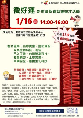 為打造黃偉哲市長「希望家園」的施政願景,勞工局積極辦理各項就業徵才活動,並因應產業求才需求,勞工局職訓就服中心將於01月16日(四)14時00分至16時00分在新市區三里聯合活動中心(新市區民生路112號)辦理【徵好運】新市區新春就業徵才活動,邀請19家廠商提供逾600個職缺,歡迎求職民眾踴躍前往參加,洽詢電話:06-5892325。