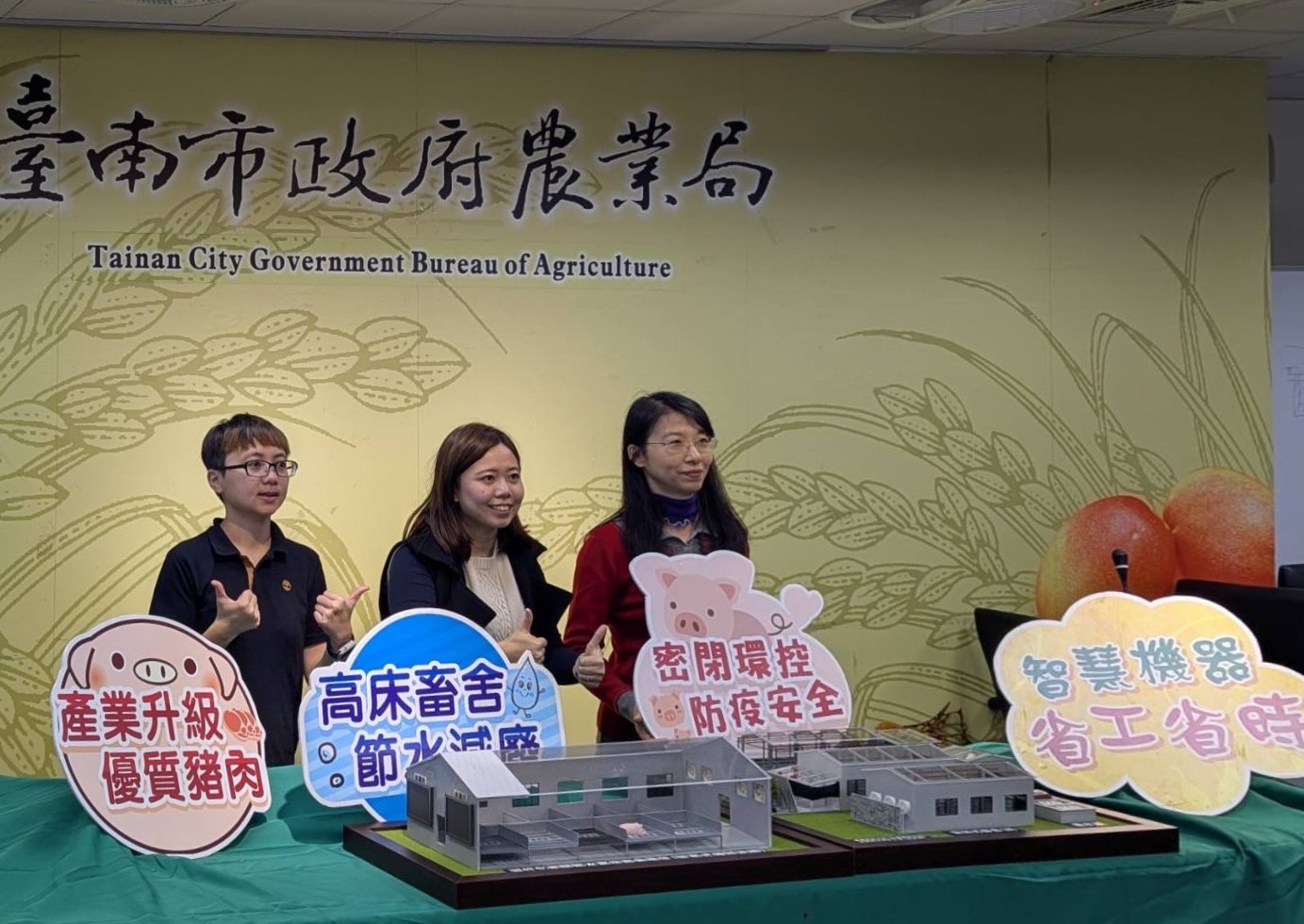 市長黃偉哲表示,臺南市有527場養豬場,在養頭數約58萬餘頭,是全國第四大養豬重鎮。為協助產業應對成本上升、氣候變遷及環保標準等諸多不利經營之因素,南市府這四年持續鼓勵養豬業者,透過購置新式設施及設備,改善傳統老舊設施(備)無法克服的問題如異味、廢水、育成率、配種率、疾病發生率、人力及用水等,除了保障市民的生活品質,也大幅提升肉品品質及經營效率。