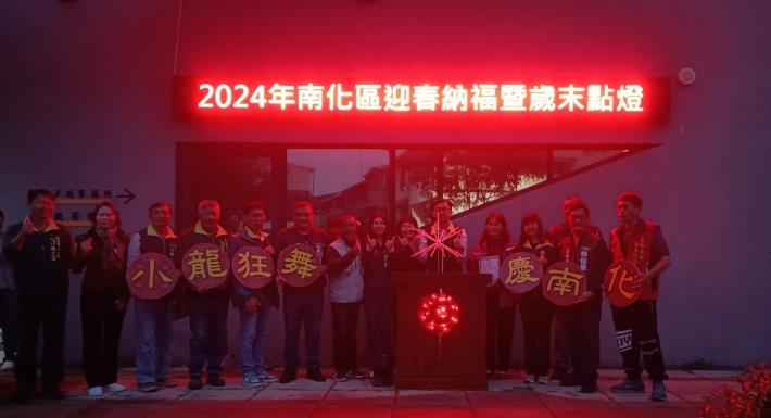 本所於12月23日(星期一)下午5時許在公所廣場前舉辦「2024年南化區迎春納福暨歲末點燈」,由南化區長徐全立、郭國文立委服務處特助賴懋慶、周奕齊議員夫人龍思呈,林俊憲立委特助郭守義、陳亭妃立委後援會葉仁長主任、西埔國小校長姜建宏、南化天后宮主委李瑞金、南化天后宮管理人顏文斌、南化教會牧師周玉真、南化區各里里長、各社區發展協會理事長、以及鄉親共同參與,參加人數約計100人。