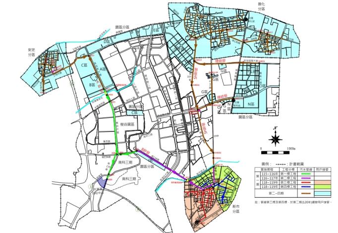 水利局表示,新市污水下水道系統計畫範圍涵蓋新市、善化、安定都市計畫區及臺南園區特定區(不包括科學園區部分)。整體計畫分四期進行,預計自114年起展開,總建設期程24年,總經費約86.6億元,管線全長約53公里,預計接管47,100戶用戶,將全市用戶接管率提高6.48%。其中,第一期(114年至119年)計畫經費29.8億元,將建設17公里污水管線(主幹管及新市分區管網)、完成第一期水資源回收中心(每日處理15,000公噸),並接管2,750戶用戶。預計於119年前完成廠站建設,隨後推動善化、安定及南科特定區的後續管網與用戶接管工程。
