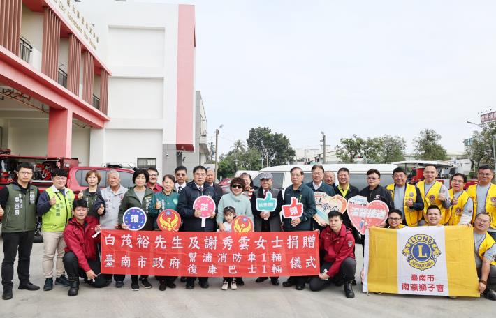 南贏建設開發有限公司捐贈臺南市政府幫浦消防車1輛及復康巴士1輛,為本市消防救援能力注入新動能,今(30)日上午由市長黃偉哲代表受贈並回贈感謝狀及獎座,市議員蔡蘇秋金、蔡秋蘭、陳昆和、方一峰等也到場參與,感謝此善行義舉造福地方人群。