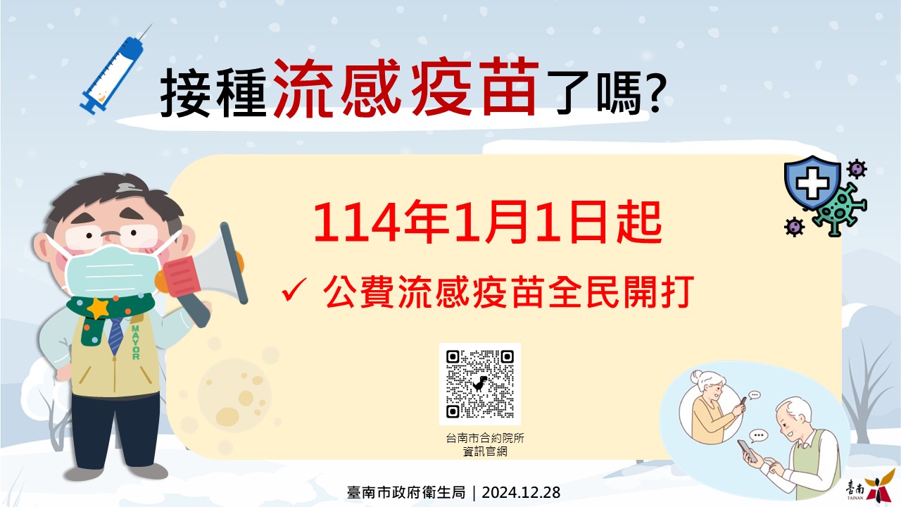 據疾管署資料顯示流感已於本週進入流行期,預估農曆年前後進入高峰,在其他國家(日本、歐洲、美國)皆有升溫的趨勢,特別是日本流感有暴增的情形,接種疫苗需兩週才可達到完整保護力,面對人潮流動大的春節假期疾病傳播風險增加,預計趁春節出國旅遊但尚未接種本季流感疫苗者,可以利用流感疫苗接種對象擴大期間接種一劑公費疫苗,不讓病毒破壞快樂出遊的好心情。流感、新冠及肺炎鏈球菌疫苗可以分開不同部位同時接種,如非同時接種亦可間隔任何時間接種。符合資格者應盡快前往合約院所、衛生所及社區接種站隨到隨打,或114年1月1日後透過台南打疫苗平台進行預約。 (https://health-reservation.tainan.gov.tw/)。